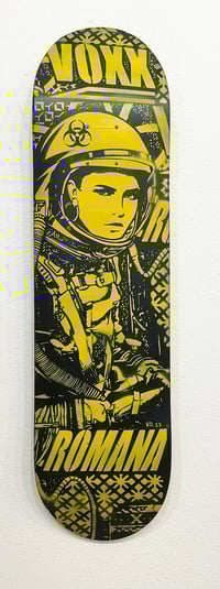 Original stencil spray painted on skateboard by artist Voxx Romana, created 2023. Size 8x31 inches wood skateboard with Montana gold archival spray paint. The artwork will be professionally packaged and shipped out with delivery confirmation and tracking. All paintings come with a letter of authenticity and free stickers.